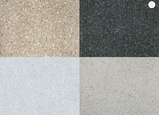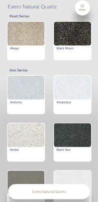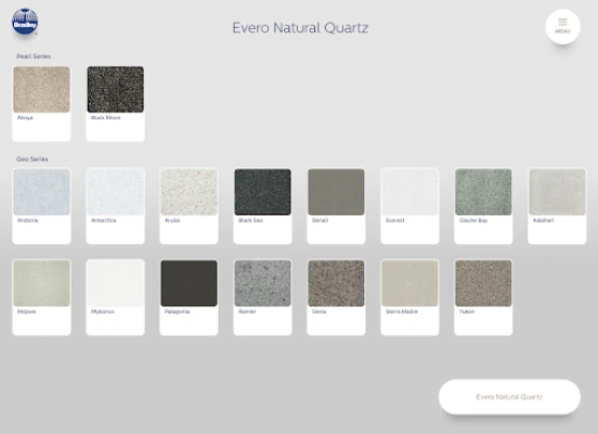 •Full screen images of all Terreon® Solid Surface, Evero™ Natural Quartz Materials, Bradmar Solid Plastic, Powder Coated Steel, and Stainless Steel.