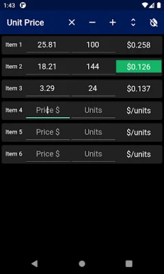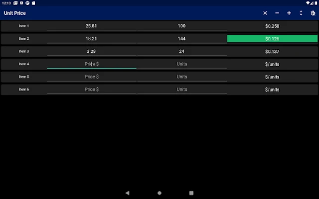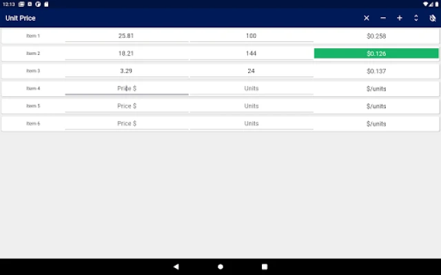 This app is fast because it's dead simple: just type two numbers and you're done. To use the app, just enter the price of the item and the number of units (oz, lbs, number in package, etc). It will calculate the unit price and highlight the best price as soon as the numbers are entered. There are fields for the quantity, name of each item and the name of each item's units, but they're optional.